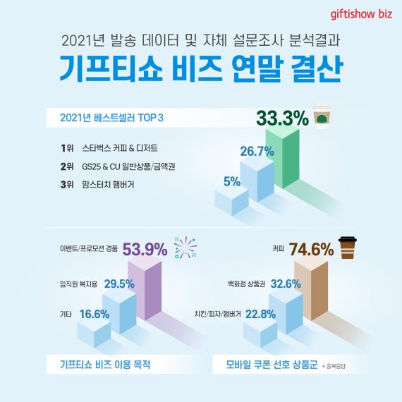 기프티쇼 비즈에서 올 한해 가장 많이 발송된 상품은 '스타벅스 커피 및 디저트'(33.3%)다. 이어 'GS25 및 CU 편의점 일반상품·금액권'(26.7%), '맘스터치 햄버거'(5.0%), '이디야 커피'(4.9%)가 뒤를 이었다.