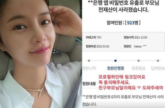 황정음은 자신의 인스타그램에 "은행 앱 비밀번호 유출로 부모님 전재산이 사라졌다"는 청와대 국민청원 청원글을 게시하며 "친구 부모님 일이다. 꼭 도와달라"고 청원을 독려했다. 이와 함께 프로필 페이지를 수정해 해당 청원글 링크를 게재했다.