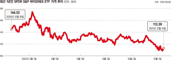 16일 월스트리트저널(WSJ)에 따르면 코로나19 확산에 따른 각종 임상시험 중단 및 코로나 변이 바이러스 등장으로 인해 S&P 바이오테크 산업지수(SPSIBI)를 추종하는 대표적인 바이오 상장지수펀드(ETF)인 SPDR S&P 바이오테크 ETF는 올들어 이날까지 23% 가까이 하락했다.