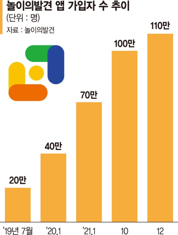 16일 키즈놀이앱 '놀이의발견'에 따르면 지난 2019년 4월 서비스를 시작한지 2년 6개월 만인 지난 10월 회원수가 100만명을 돌파했다. 올 12월 기준으로는 110만명을 넘어 1등 키즈놀이앱으로 자리매김했다.