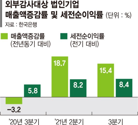 16일 한국은행이 발표한 '2021년 3·4분기 기업경영분석'에 따르면 3·4분기 외부감사대상 법인기업 2만120개의 매출액 증가율은 전년동기대비 15.4%로 나타났다. 삼성전자와 SK하이닉스 두 곳을 제외해도 15.2%였다. 전분기(18.7%)보다 상승폭은 다소 줄었지만 상승세를 지속하면서 총자산 증가율은 전기(1.9%) 대비 확대된 3.1%로 상승했다.