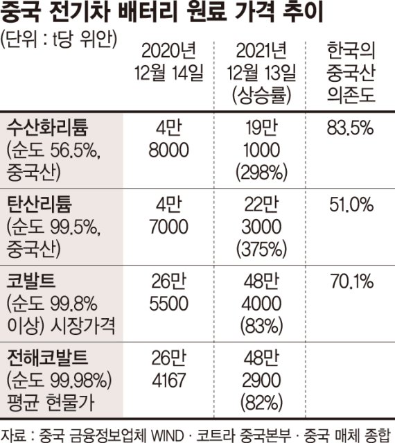 19일 중국 금융정보업체 윈드(WIND)에 따르면 지난 13일 기준 한국의 중국 의존도가 83.5%에 달하는 중국산 수산화리튬(순도 56.5%) 가격은 t당 19만1000위안으로 집계됐다. 이는 1년 전 4만8000위안과 견줘 298%가량 폭증한 것이다.