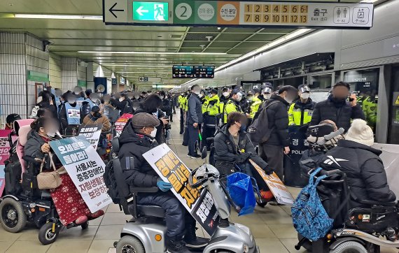 20일 서울교통공사 등에 따르면 이날 오전 7시12분께부터 5호선 왕십리역에서 시작된 전국장애인차별철폐연대(전장연)의 ‘장애인 이동권 보장 시위’가 두 시간여 만인 오전 9시45분께 종료됐다.