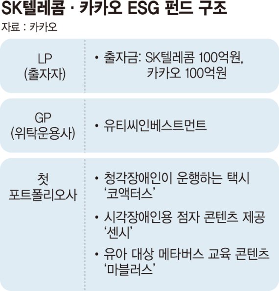 SK텔레콤과 카카오는 지난 8월 각각 100억 원을 출자해 총 200억 원 규모 ESG 공동펀드를 조성했다.