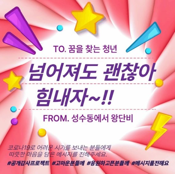 문체부는 이번 캠페인을 위해 지난 1일부터 22일(수)까지 '방역 의료진', '소상공인', '청소년', '청년', '어르신' 등 우리 이웃에게 전하고 싶은 문자를 온라인으로 남기는 행사를 진행하고 있다. 이 중 일부 문자를 선정해 캠페인 영상으로 제작할 계획이다.
