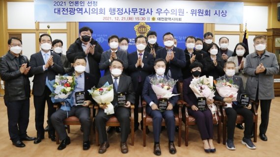 시의회 출입 12개 언론사는 21일 대전시의회 4층 대회의실에서 ‘2021 언론인 선정 행정사무감사 우수의원·우수위원회 시상식’을 열고 우수의원과 우수위원회에 상패를 수여했다. 시의회 출입 정치부 기자들이 선정하는 행감 우수의원·우수위원회 시상식은 올해로 4회째다.