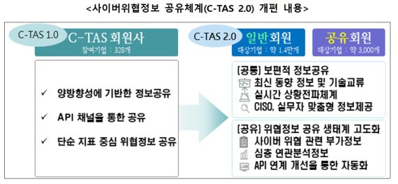 이번 C-TAS 개편은 유관기관과 정보보호 최고책임자(CISO) 등을 대상으로 그간의 의견 수렴 결과를 반영하여 보다 많은 기업이 신뢰성 높은 위협정보를 실시간으로 공유 및 활용할 수 있도록 일반 및 공유회원으로 구분하는 것으로 개선했다.