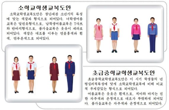 매체는 "소학교 학생 교복 도안은 장난 세찬 소년기의 특성에 맞는 색깔과 형식으로 되어있고 초급중학교는 이 시기 학생들의 연령 심리적 특성에 맞게 비교적 무게감 있는 형식으로 되어 있다"라고 설명했다.
