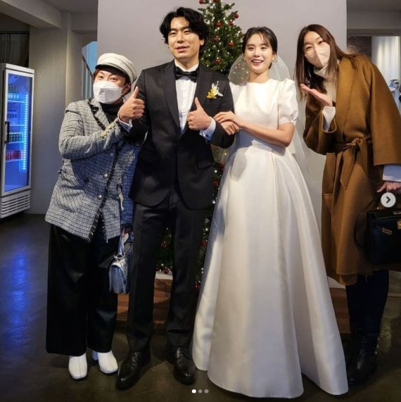 '나 혼자 산다' 멤버들이 올린 사진에는 이시언, 서지승이 식장에 나란히 서서 서약을 하는 모습이 담겨 있는가 하면, 마주 선 채 맞절을 하는 모습이 담겼다.