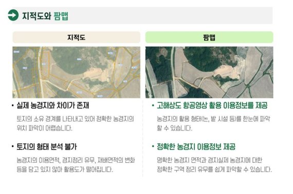 팜맵은 토지 소유권을 도면에 구획한 지적도와 달리 항공 영상 등을 활용해 실제 경작하는 토지에 대한 면적과 논, 밭, 시설, 과수 등 속성을 구획한 지도를 말한다. 그동안 정부·지자체·연구기관 등에서 팜맵을 경지면적 조사, 농경지 점검 및 작물 실태 조사 등에 활용해 왔다.