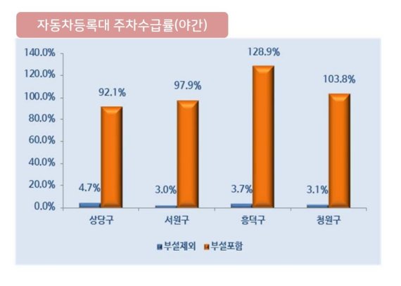 부설주차장을 제외하면 주차수급률은 상당구 4.7%, 서원구 3.0%, 흥덕구 3.7%, 청원구 3.1%로 급격히 준다.
