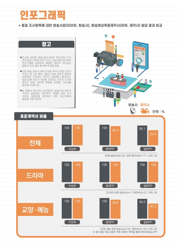 이번 점검결과 방송 프로그램 외주제작 시 서면계약 활용에 대해 제작사는 99.4%가 서면계약으로 진행하고 있다고 응답해 전년 대비 0.7%포인트 상승한 것으로 나타났다. 또한, △드라마 부문 평균 100% △교양·예능 부문 평균 89.2% 수준으로 계약 유형에 따라 서면계약 비율에 있어 차이를 보였다.