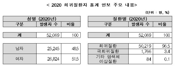 질병청은 지난해 희귀질환자 발생 정보와 2019년 희귀질환 발생자의 당해연도 사망 및 진료 이용정보 관련 자료를 수집·분석해 이번 통계 연보에 담았다.