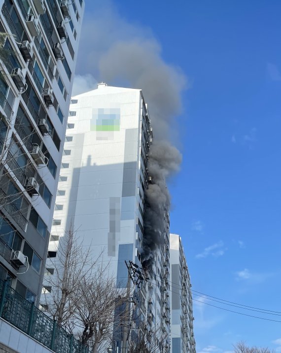 [울산=뉴시스]박수지 기자 = 29일 오전 11시 26분께 울산시 울주군 범서읍 구영리의 20층짜리 아파트 9층에서 화재가 발생했다.