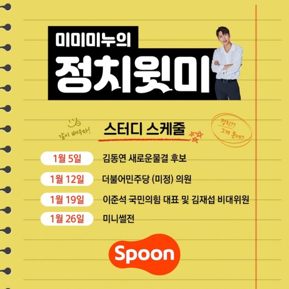 특집 방송은 스푼의 오리지널 콘텐츠 '미미미누의 정치윗미'를 통해 이뤄진다. '미미미누의 정치윗미'는 50만명의 구독자를 보유하고 있는 유튜버 '미미미누'가 참여하는 스푼 계정으로 정치인과 함께 정치 용어와 정책, 이슈를 쉽게 설명한다.