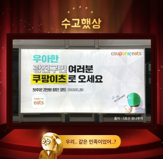 단연 돋보이는 수상자는 '쿠팡이츠'다. 지난 11월, 쿠팡이츠는 서울 주요 지하철역에 "우아한 ○○구민 여러분, 쿠팡이츠로 오세요"라는 광고를 진행했다.