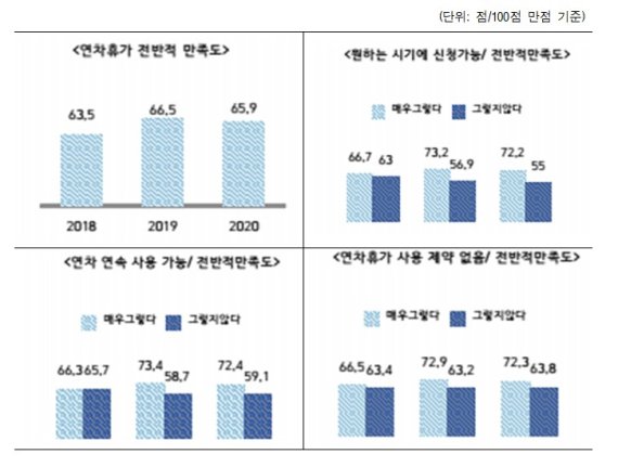 휴가를 사용하는 방식 또한 달라졌다. 근로자들의 연차 일수·사용률은 전년과 큰 차이가 없으나, 여행을 위한 연차 사용은 24.2%로 전년 대비 11.1%포인트 감소했고, 휴식(38.7%로 4.8%포인트 증가)·집안일(22%로 4%포인트 증가)을 위한 연차 사용은 증가했다.