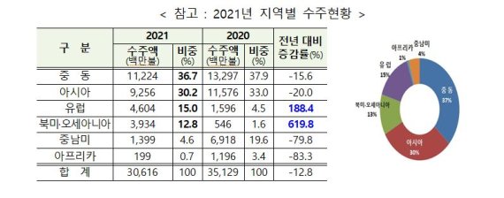 올해 국내 총 318개사가 91개국에서 306억불(501건)을 수주했다. 지역별로는 중동(37%), 아시아(30%), 유럽(15%), 북미·오세아니아(13%) 순으로 중동지역 수주실적이 가장 높았으나, 북미·오세아니아(620%↑), 유럽(188%↑)이 전년 대비 크게 반등하는 등 수주지역 다변화가 이뤄졌다.