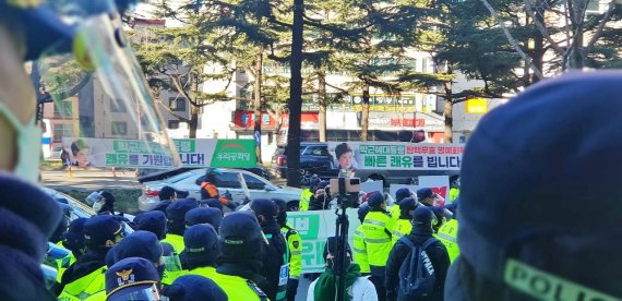 윤 후보가 시당에서 간담회를 열고 있을 무렵 양측은 마주 선 채 서로를 향해 스피커를 튼 채 집회 열기를 끌어올렸다.