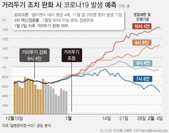 31일 질병청과 한국과학기술연구원(KIST)이 공동 분석한 '오미크론 변이 영향을 반영한 코로나19 발생 예측 모형'에 따르면 내년 1월2일 이후 영업제한을 오후 9시에서 오후 10시로 1시간 완화하면 확진자 수가 1월말 1만8000명대로 증가하는 것으로 나타났다.