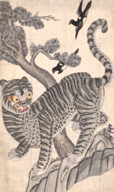 '호작도'는 호랑이와 까치 그림으로 기쁜 소식을 전해주고 나쁜 기운을 물리친다고 여겨 민간에서 유행했다. 이 그림의 호랑이는 새빨간 입술과 뾰족한 이빨을 드러내고 있지만, 익살스러운 표정으로 친근함을 느끼게 한다.