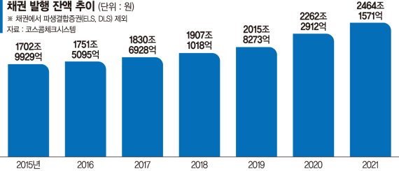2일 코스콤체크시스템에 따르면 지난해 12월 30일 기준 우리나라 채권 잔액은 2464조1571억원으로 집계됐다. 2020년 말(2262조2912억원) 대비 201조원 넘게 늘었고 2019년 말(2015조8273억원)에 비해서는 448조원 넘게 증가한 수치다. 채권 시장 규모가 매년 100억원 안팎의 증가 추이를 보였던 것을 고려하면 2~3배의 증가세를 보인 것이다.