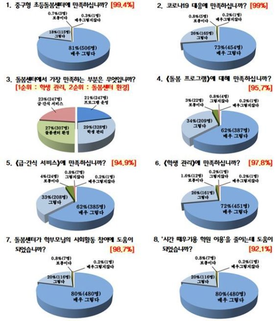 초등돌봄센터가 학부모 사회활동 참여에 도움이 됐느냐는 질문에는 98.7%가 그렇다고 응답했다. 맞벌이 가정에 특히 도움이 됐다는 의견이 주를 이뤘다.