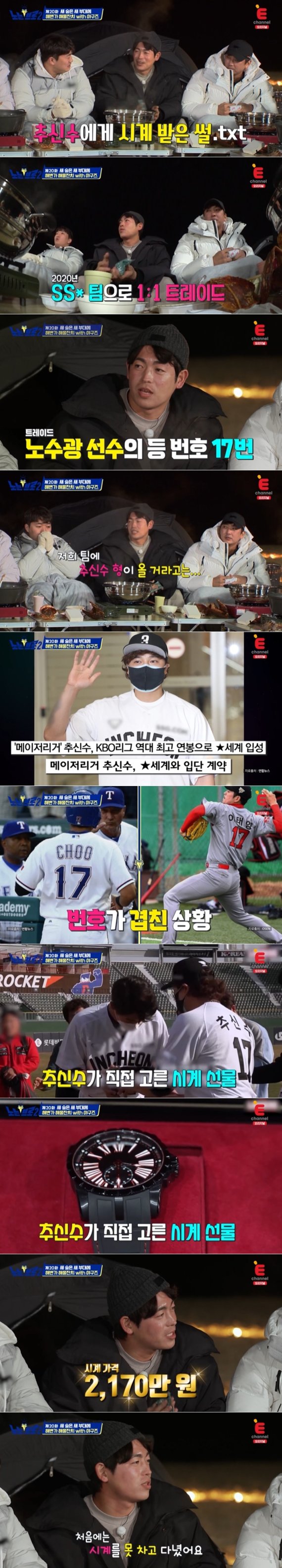 지난 3일 방송된 E채널 예능 '노는브로 시즌2'에 출연한 이태양은 선배 추신수에게 받은 명품 시계와 관련된 일화를 공개했다.