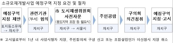 소규모 재개발은 △면적 5000㎡ 미만 △노후·불량건축물의 수가 전체 건축물 수의 3분의 2 이상 △폭 4m와 8m 이상 둘 이상의 도로에 접해야 하는 요건을 모두 갖춰야 한다.