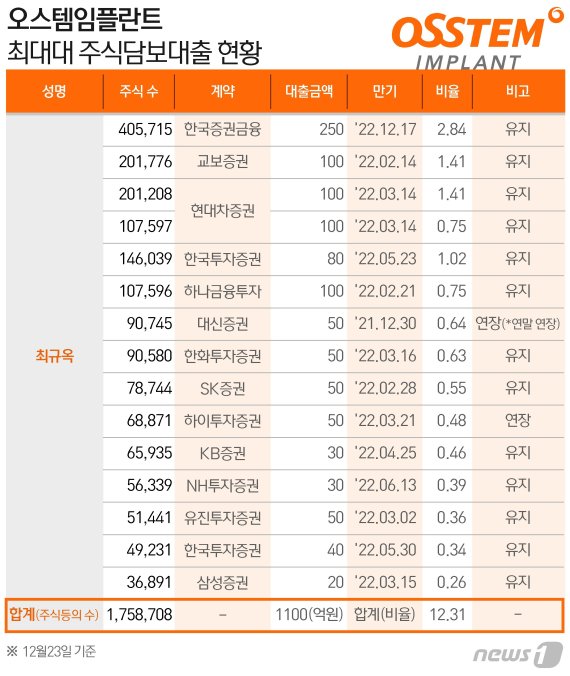 다만 오스템임플란트 주가가 지난해 1년 동안 180% 이상 상승하면서 5만원이던 주식이 14만원대까지 올랐기 때문에 하한가를 2번 이상 맞는다 하더라도 여전히 평가액이 담보비율을 상회하는 수준일 수는 있다.