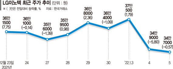 5일 LG이노텍은 전거래일 대비 2000원(0.57%) 하락한 34만7000원에 거래됐다. 전날 2만1500원(5.80%)에 이어 이틀 연속 하락세를 보였다.