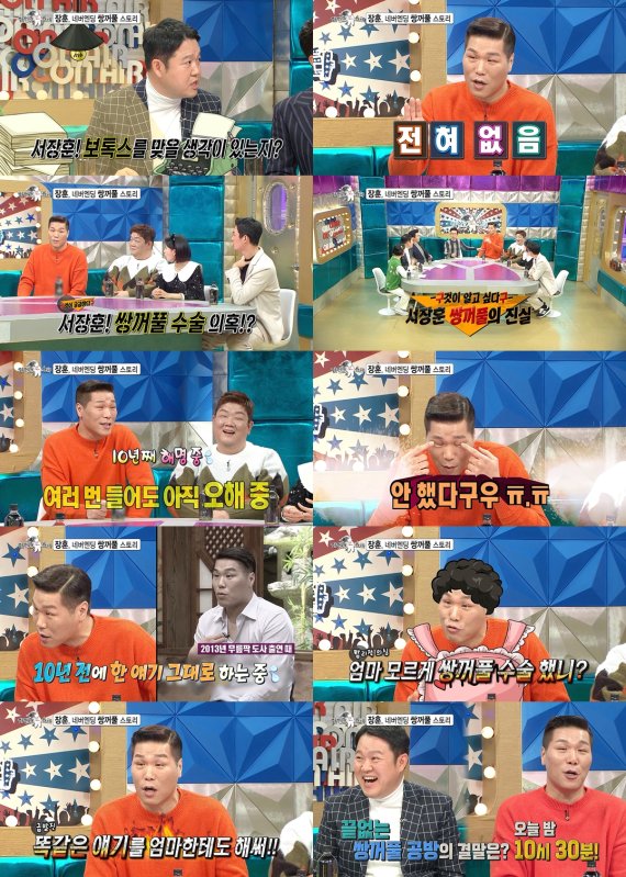 이에 서장훈은 "했던 얘기 또 하고 옛날에 다 한 거야 하지만 또 해줄게"라며 "피곤하면 생기던 쌍꺼풀이 어느 날부터 하루 종일 안 풀리기 시작했다"고 말했다.