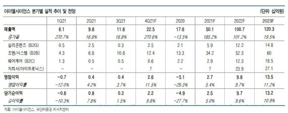 허선재 유안타증권 연구원은 "아이엘사이언스는 작년 4분기부터 대형 건설사향 수주 물량이 큰 폭으로 늘어나고 있으며 실리콘렌즈의 사용 범위 확대에 따라 미래차와 헤어케어 부문에서의 신사업 추진 또한 가시화 중"이라면서 "더불어 최근 190만주 규모의 전환사채(CB) 물량 또한 시장에서 소화되며 오버행 이슈도 해소됐기 때문에 향후 견조한 주가 흐름을 기대해도 좋다고 판단한다"고 말했다.