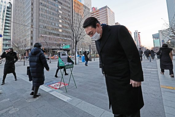 윤 후보는 어제에도 여의도역에서 시민들에게 '깜짝' 출근 인사를 했다. 윤 후보는 "시민 여러분, 새해 복 많이 받으십쇼"라며 90도로 허리를 숙였다. 어제 출근길 인사는 윤 후보의 의사에 따라 즉흥적으로 이뤄진 것으로 알려졌다.
