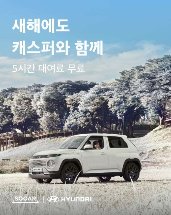 쏘카는 지난 연말까지 진행 예정이었던 캐스퍼 5시간 무료 대여 프로모션을 오는 1월 말까지 연장한다고 7일 밝혔다. 오는 31일까지 5시간 무료 대여 쿠폰을 다운받아 사용할 수 있다. 5시간을 초과하는 대여요금, 주행요금, 차량손해면책상품은 별도다.