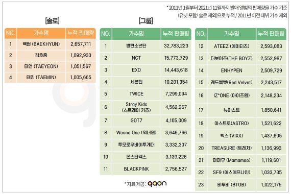 10일 가온차트가 지난 2011년 1월부터 2021년 11월까지의 누적 앨범 데이터(2011년 데뷔한 가수 기준)를 집계한 결과에 따르면 '방탄소년단'은 총 3278만3223장의 앨범을 판매했다.