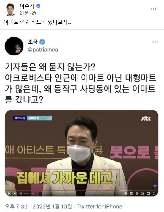 이준석 국민의힘 대표가 윤석열 국민의힘 대선후보가 이마트에서 장을 본 것을 감싸고 돌았다. 조국 전 법무부 장관이 "왜 집에서 먼 이마트까지 갔냐"고 비판한 가운데 이 대표는 "이마트 할인 카드가 있나 보지"라고 했다.