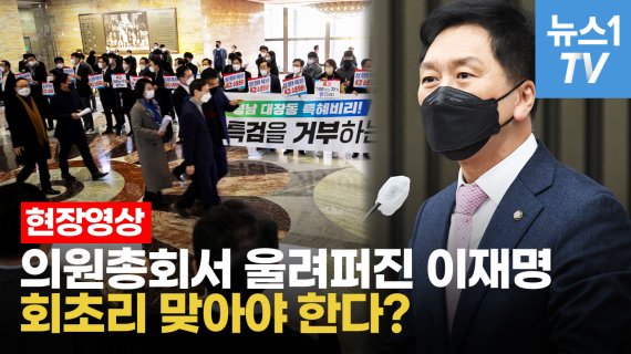 이후 김 원내대표와 국민의힘 의원들은 본회의장 앞에서 '대장동 특검' 피켓 시위를 단행했다. 당내 의총을 끝내고 나온 민주당 의원들은 피켓 시위 중인 국민의힘 의원들을 가로질러 본회의장으로 향했다.