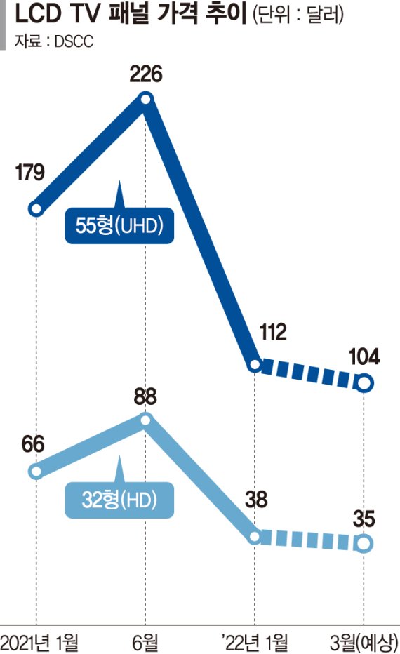 실제로 올 1월 LCD TV 패널 가격 예상치는 32형 HD 기준 38달러로 지난해 6월(88달러) 대비 64% 폭락했다. 같은 기간 43형 FHD(139달러→70달러), 49·50형 UHD(196달러→91달러), 55형 UHD(226달러→112달러), 65형 UHD(285달러→186달러) 등 전 품목의 가격이 급락했다.