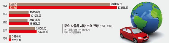 국내 시장의 판매는 글로벌 평균에 못미칠 것으로 전망했다. 이 실장은 "부품 수급 이슈는 점차 개선되지만 금리인상과 볼륨모델 신차 출시 부족으로 판매량은 1.8% 늘어난 172만대에 머물 것"이라며 "수출시장의 점진적 회복에 따른 해외공급 확대가 내수공급 개선의 제약요인으로 작용할 수도 있다"고 말했다.