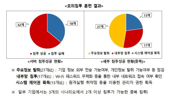 웹 업무용 서버의 경우 50개 기업중 32개 기업에서 시스템 제어권 획득, 내부망 침투, 주요 정보 탈취까지 가능한 것으로 드러났다.