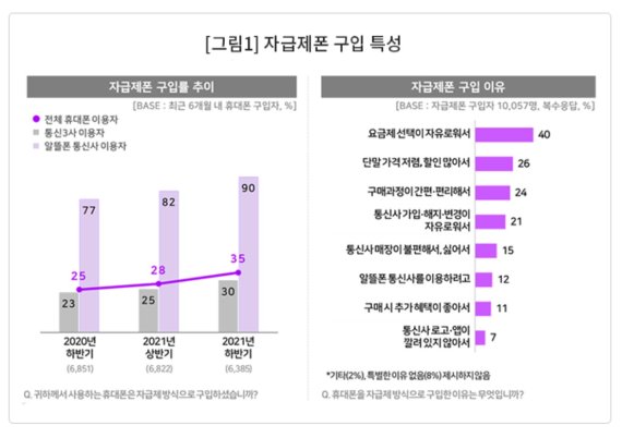 자급제폰을 구입한 이유에 대해서는 자유로운 요금제 선택이 40%로 가장 많았으며 Δ단말 가격이 저렴하고 할인이 많아서(26%) Δ구매과정이 간편하고 편리해서(24%) Δ통신사 가입·해지·변경이 자유로워서(21%) Δ통신사 매장이 불편하고 싫어서(15%) Δ알뜰폰 통신사를 이용하려고 (12%) Δ구매 시 추가 혜택이 좋아서(11%) Δ통신사 로고 및 앱이 깔려있지 않아서(7%) 순이었다.