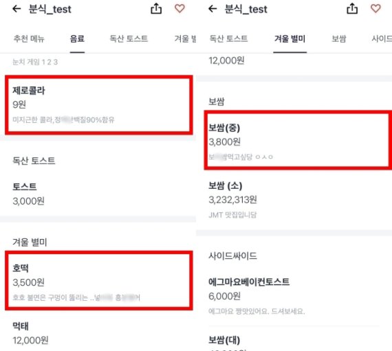 공개된 사진에는 '분식_test'라는 업체명과 추천메뉴, 음료, 독산 토스트, 겨울 별미, 보쌈 등 메뉴들이 적혀 있었다.