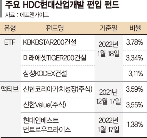 공모펀드인 '신한코리아가치성장(주식)'과 '신한Value(주식)'도 지난 12월 17일 기준 각각 3.59%, 3.55% 편입 비율을 나타냈고, '현대인베스트먼트로우프라이스'는 지난 17일 기준 1.38%의 비율로 HDC현대산업개발을 담고 있다.
