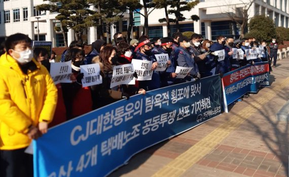 울산지부는 "CJ대한통운 노조의 총파업 투쟁이 23일째 이어지고 있다"며 "더이상 과로사 없는 택배현장을 만들자고 국민과 함께 약속했던 사회적 합의를 이행하라는 소박한 요구"라고 주장했다.