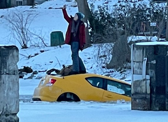 운전자는 다행히 차가 얼음에 걸려 천천히 가라앉은 덕분에 트렁크 위로 피신할 수 있었다. 운전자는 젊은 백인 여성이었다.