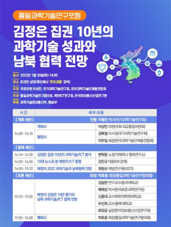 마지막 주제발표자인 한국과학기술정보연구원 최현규 책임연구원은 '북한의 2021 과학기술과 남북협력 전망'을 주제로 향후 북한 과학기술과 남북협력의 추진 방안을 제시한다.