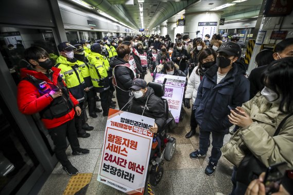 서울교통공사 관계자는 "장애인 단체 회원들이 휠체어를 타고 각 역에서 승하차를 반복하고 있다"며 "현재는 반대편 오이도행 지하철을 타고 이동 중에 있다"고 전했다.