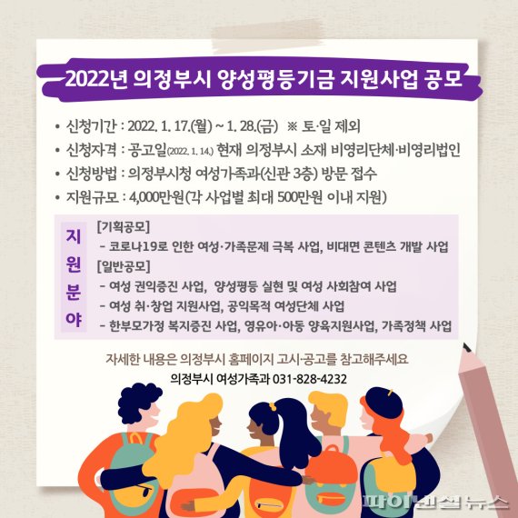 【파이낸셜뉴스 의정부=강근주 기자】 의정부시가 오는 1월28일까지 양성평등 촉진과 여성 권익 증진, 여성 사회참여 확대를 도모하기 위해 2022년 의정부시 양성평등기금 지원 사업을 공모한다.