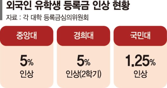23일 각 대학에 따르면 성균관대와 중앙대는 올해 1학기부터 외국인 학생의 등록금을 전년 대비 5% 인상하기로 결정했다. 경희대는 2학기 등록금부터 현행 대비 5% 인상한다.